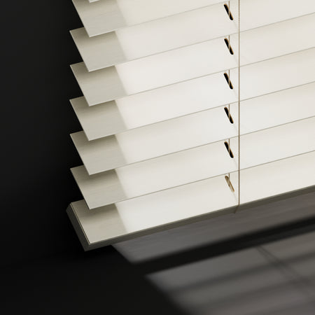 Dekkend gelakt of natuurlijk gebeitst. We bieden al onze houten jaloezieën in de perfecte 50mm lamel of extra brede 65mm, mét of zonder ladderband.
